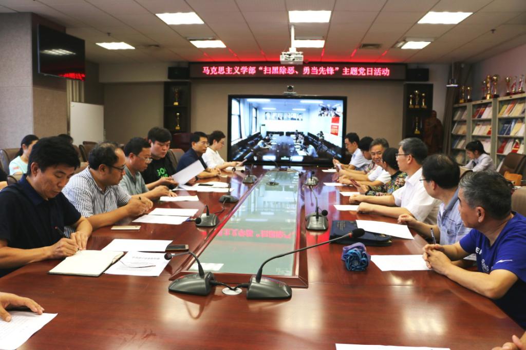 为贯彻落实党中央关于推进扫黑除恶专项斗争的决策部署,9月19日,马克思主义学部“扫黑除恶、勇当先锋”主题党日活动于JC909举行,会议采取曲阜、日照两校区现场视频连线方式,马克思主义学部党委书记张立兴主持会议,学部党委副书记宋钧文传达上级有关文件和会议精神,马克思主义学部马克思主义欧冠直播平台 教工第一、第二支部,欧冠直播平台 教工支部,学部研究生第一、第二支部,本科生支部等6个支部的63位党员(部分党员因上课或参加学校组织的座谈会请假)参加了党日活动。