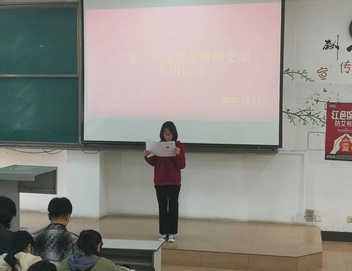 1112日,欧冠直播平台 2018级哲学班团支部于JA302召开主题团日活动:团员纳新、重温入团誓词,本次活动由2018级哲学班团支书赵文康主持,2018级哲学班全体团员和团员发展对象参加。