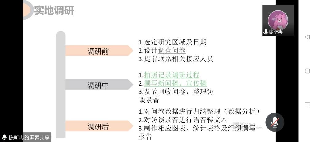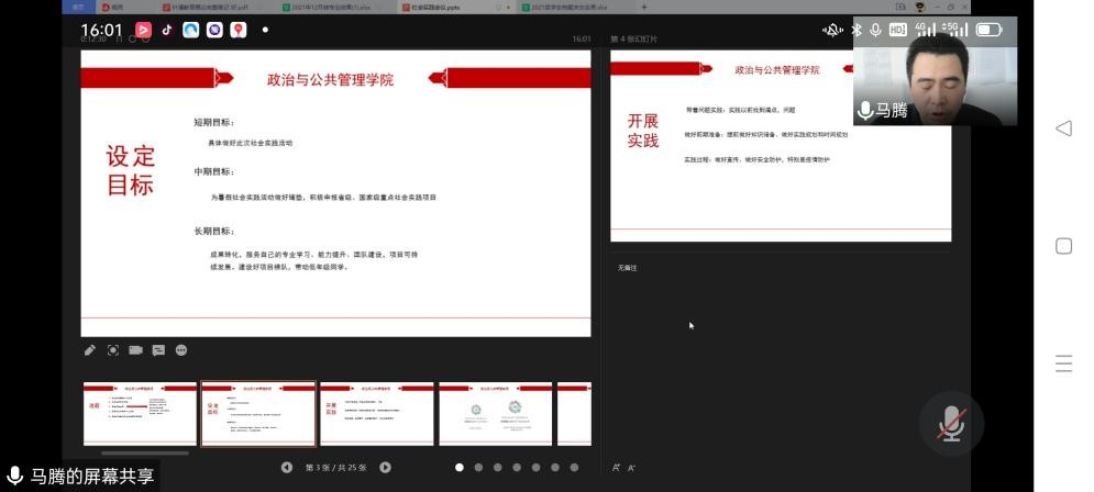 随后马腾老师就如何选题等问题从更宏观的角度进行指导。他表示,选题时应立足党和国家中心工作、关注社会热点问题、结合活动主题、结合专业特长和个人特长、结合指导教师专业特长或项目研究;设定目标时,需分别设定好短期、中期、长期多个阶段的目标,不只是做好本次社会实践活动,还要为暑假社会实践活动做好铺垫,积极申报省级、国家级重点社会实践项目,更要注重成果转化,服务自己的专业学习、能力提升、团队建设,重视项目可持续发展,建设好项目梯队;开展实践时,要带着问题去实践,实践前先找到痛点与问题,做好前期准备,提前做好知识储备、实践规划和时间规划,在实践过程中做好宣传与安全防护,特别是疫情防护等。
