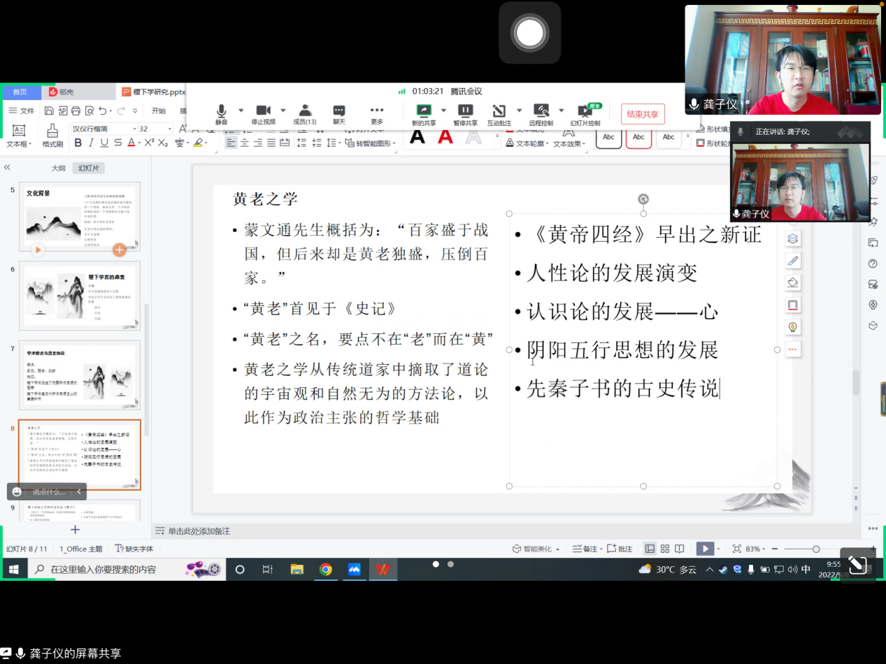 政研论坛第三十三期中国哲学专业研究生读书交流会于JC603教室举行。博士研究生靖军出席本次读书会,2020级、2021级中国哲学专业硕士研究生积极参加。