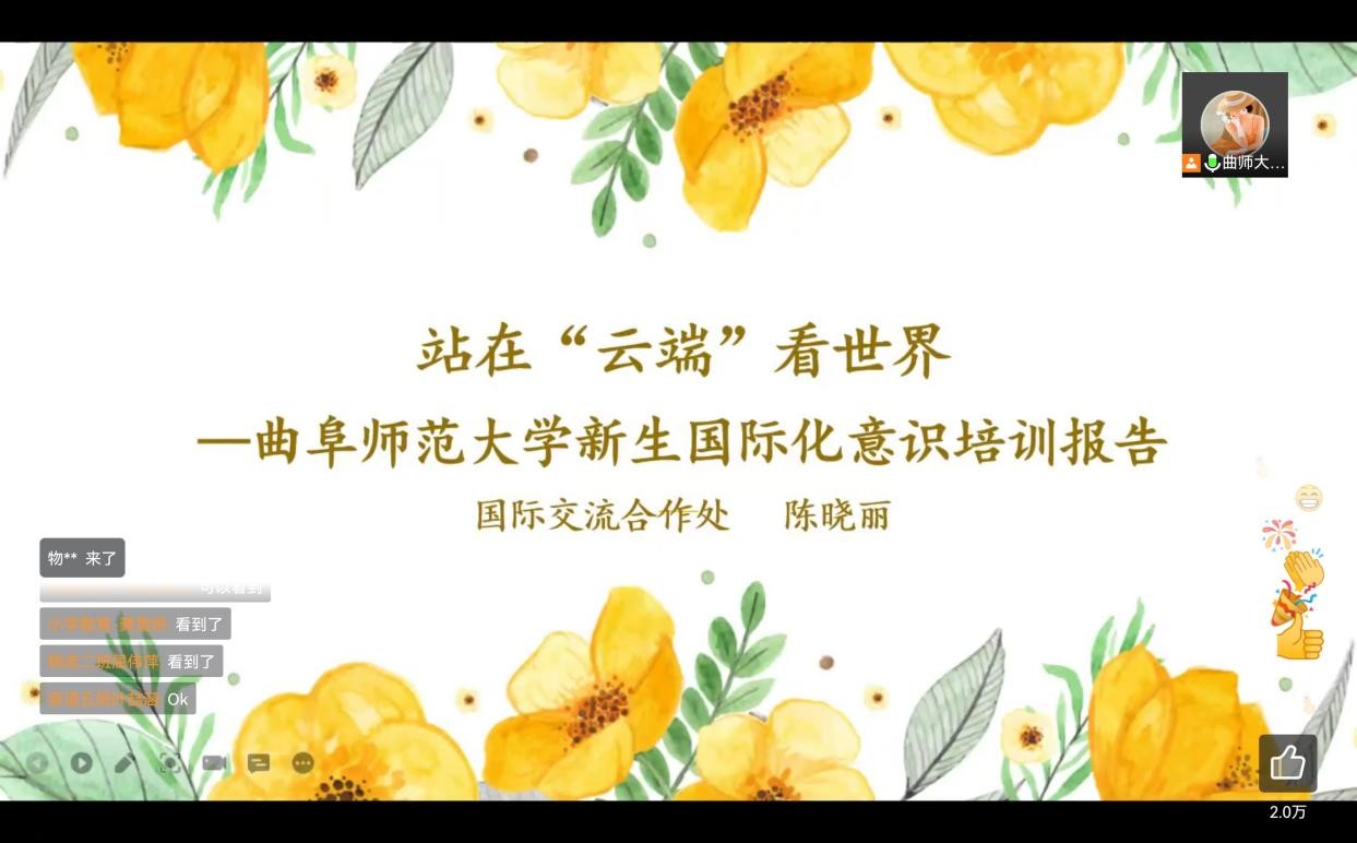 利用腾讯会议对2022级新生在线上进行国际化意识教育,曲阜师范大学国际交流合作处陈晓丽老师主讲,2022级全体新生积极参加。