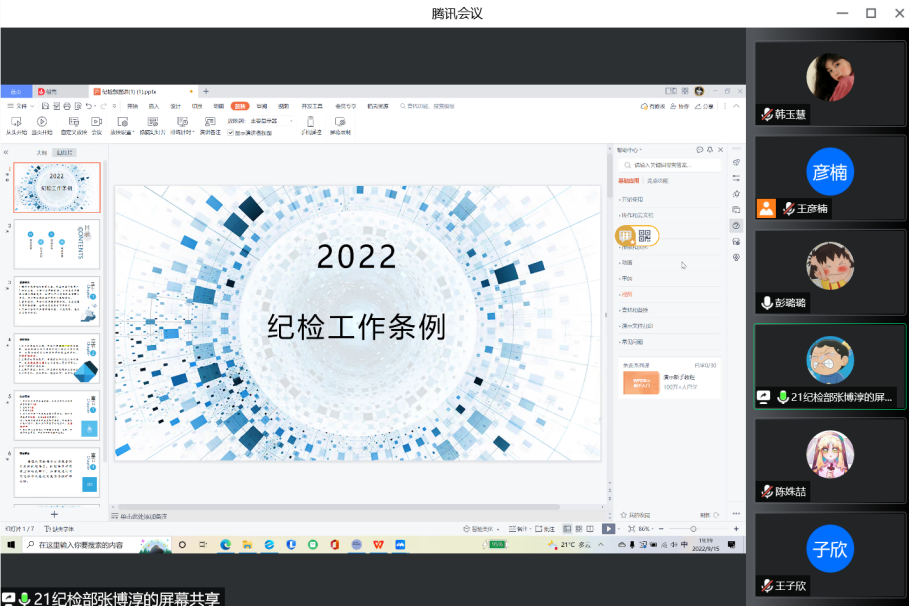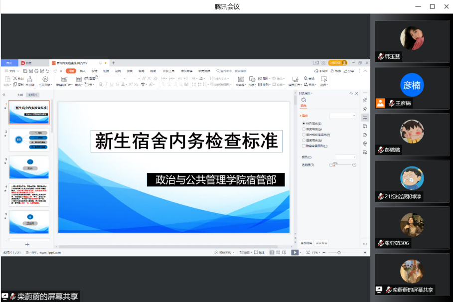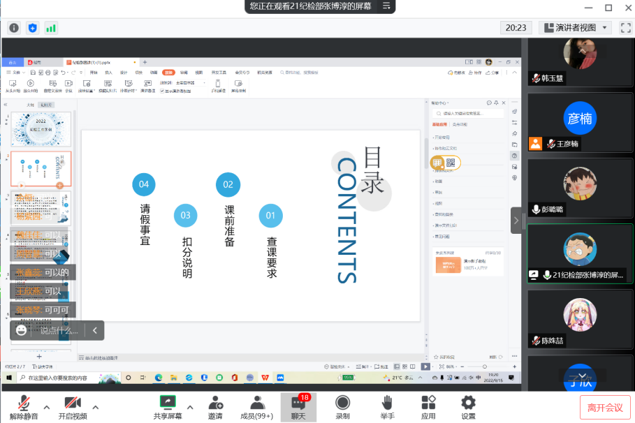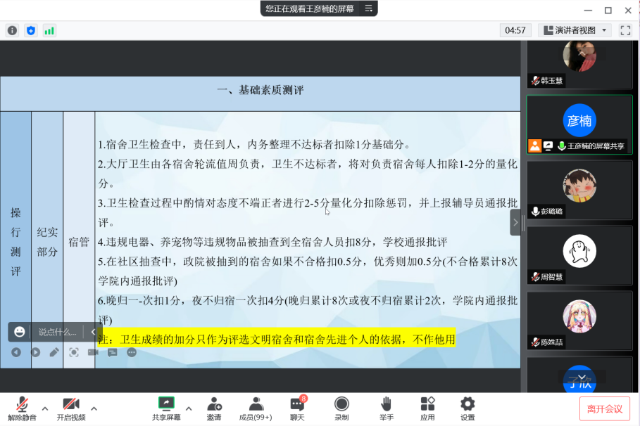 量化部、纪检部、宿管部通过线上形式对新生进行纪律教育:综合素质测评、宿舍管理有关条例宣讲,2022级学生积极与会。