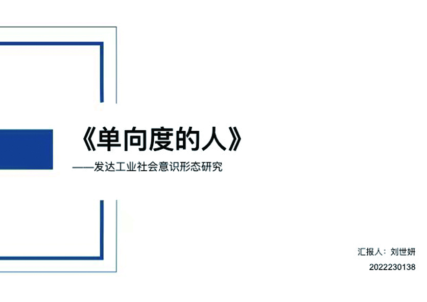 2022级刘世妍同学分享了对《单向度的人》的阅读心得。她从作者马尔库塞——法兰克福学派主要代表人物谈起,内容涉及本书的写作背景,又全面剖析了法兰克福学派面临的问题。