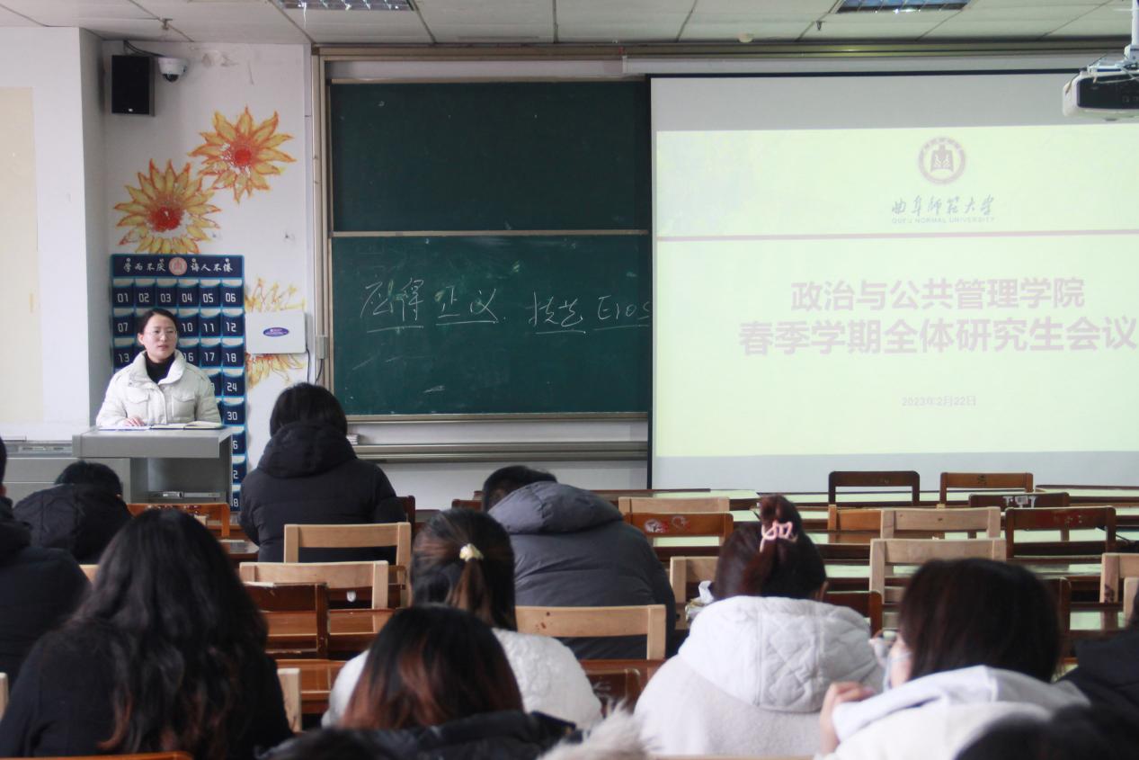 于JC605召开春季学期研究生"开学第一课”,研究生辅导员徐莉及2021级、2022级全体研究生参会。