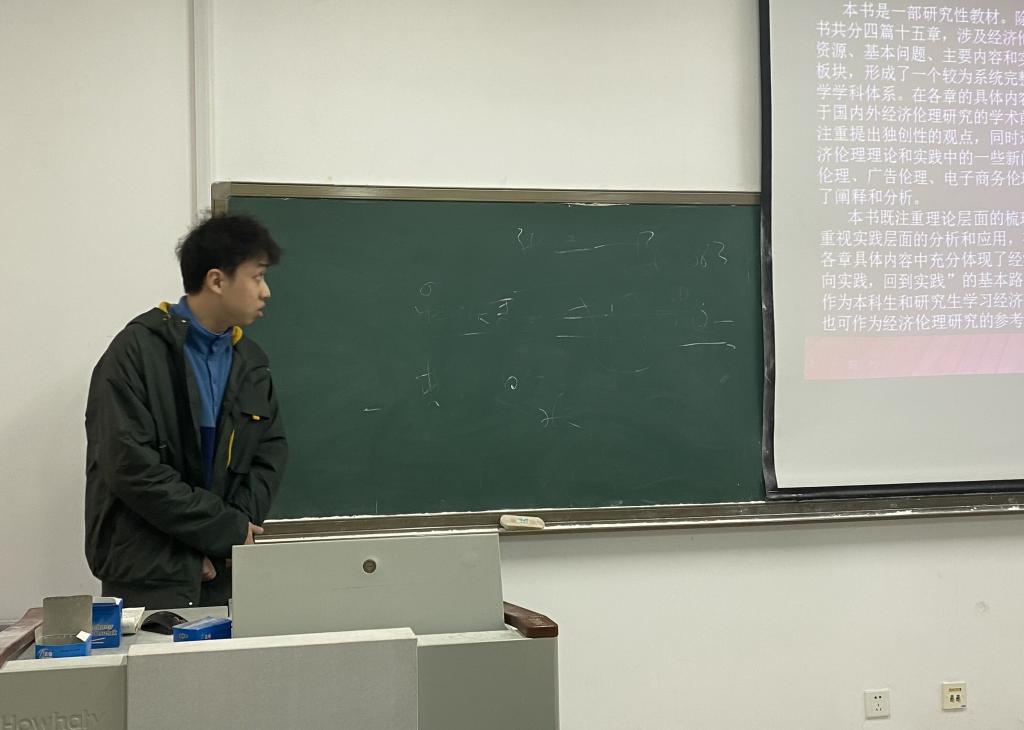 2022级任衍昊同学为我们分享了一部研究性教材《经济伦理学》。此书涉及经济伦理学的理论资源、基本问题、主要内容和实践应用四个板块。任衍昊同学结合相关论文为我们重点阐述了经济的内外道德性、效率与公平以及共同富裕的三次分配问题,充分体现了经济伦理学“面向实践,回到实践”的基本路向。让与会同学对经济伦理学的相关思想有了一定认识。