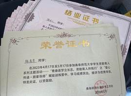 荣获“优秀组织单位”。王元如老师、耿晓敏老师荣获“优秀指导老师”。 朱晓凤同学荣获优秀朋辈导师,陈秀芹等四位同学在“感恩与心,励志于行”主题微视频活动中脱颖而出,获得荣誉证书。孙静文同学在“追梦曲园,劳动最美”主题摄影活动中脱颖而出,获得荣誉证书。姜美清等八名同学“爱心传递,朋辈导师”赋能训练营中,表现优异,获得优秀学员称号。此外,参加本次活动的九人获得结业证书。