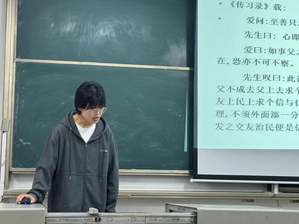 2023级李晨昱同学分享陈来《有无之境》一书作了分享报告。对于心即理说的矛盾做出阐述,阳明一方面承继了传统哲学对心的定义, 另一方面却又没有把本心与知觉加以明确分疏,未能提出明确的适合他的心学体系的对“心”的定义。