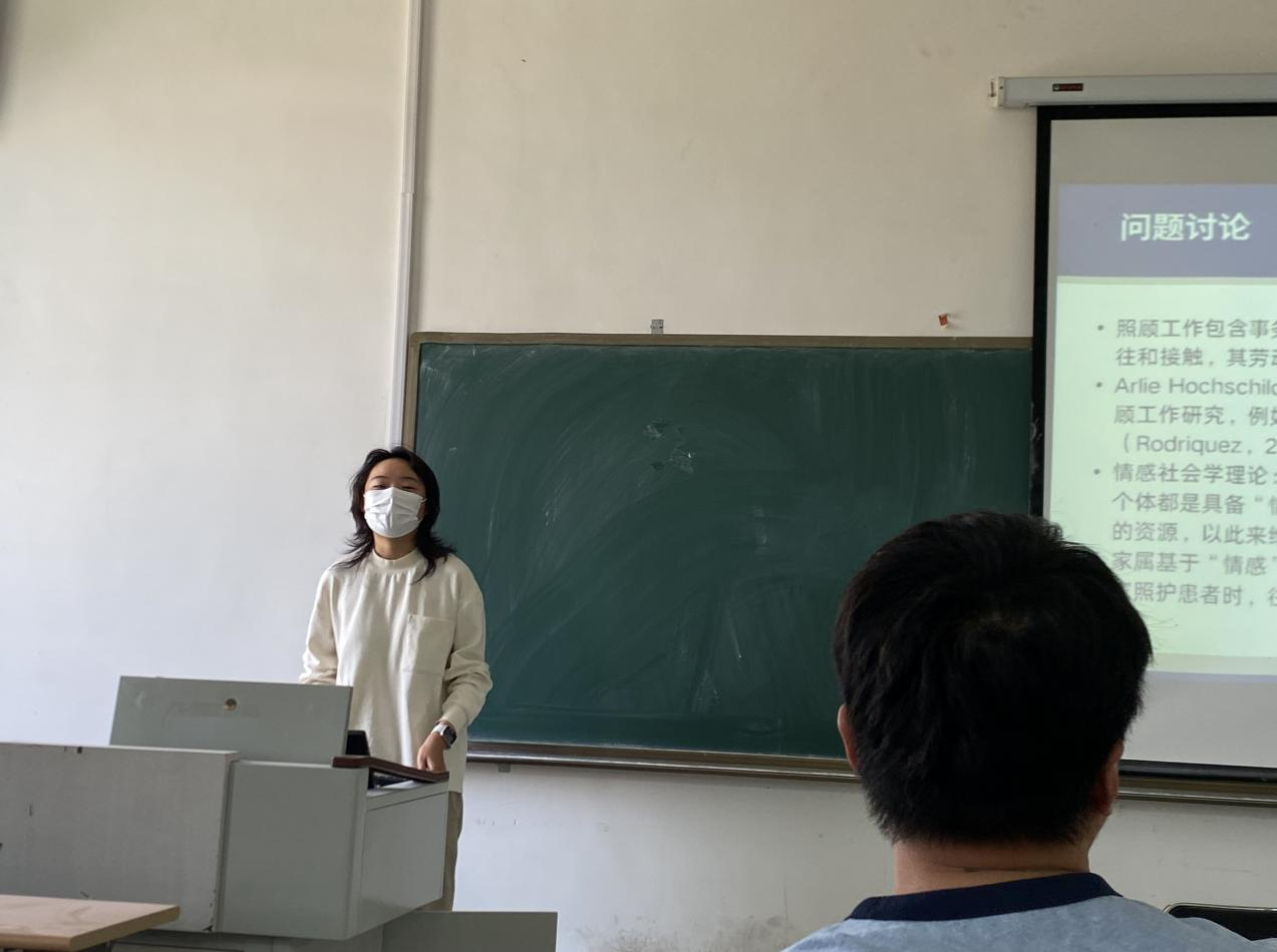 2022级杨书慧同学就“老年人照顾场域中情感互动的性别差异表现”进行主题分享。她向大家互动并提出了两个问题:“从被照顾者的老年人角度来看,是跟儿子或女婿还是跟女儿或儿媳进行深度情感交流多?”、“生活中照顾老人的子女表现有何区别?”,在场同学从伦理学视域下最朴素的个人情感角度出发,就自己的亲身经历交流了意见。