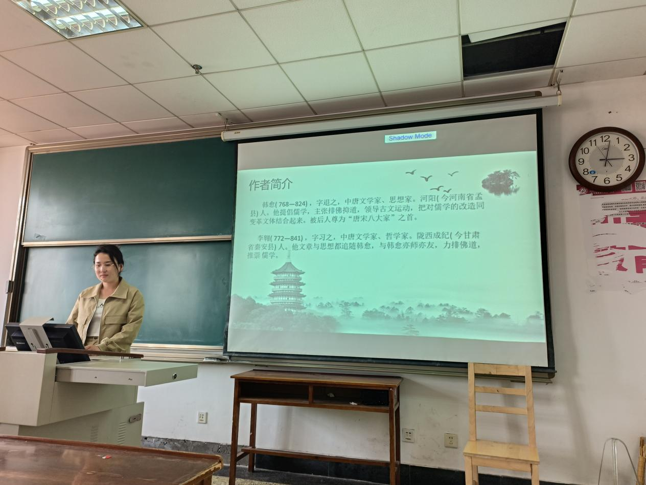 2022级于庆娟同学就《论语笔解》中的解经方式向大家分享。她介绍到,韩愈、李翱是这场儒学复兴运动的主将,在佛门强势,佛风劲吹的中唐挺身亮出儒学的大旗;韩愈倡导儒学,开启了宋代新儒学的序幕,被视之为宋代新儒学的先驱。