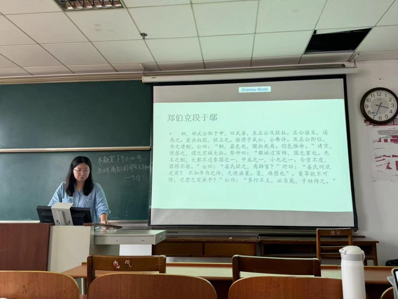 24级陈心茹同学从两个方面了分享《左传》和《论语》两本书,她指出,书中有些记述已反映出某些进步的思想,如轻视鬼神而注重人事,强调君主应忠于人民管好国家等,具有较浓厚的“民本”思想。另一方面,它也显示出春秋时政治思想的一些特点,如不承认统一的专制君权,宣扬君臣为共同的国家利益而结合,双方都有选择的自由,不主张臣民绝对效忠于君主。