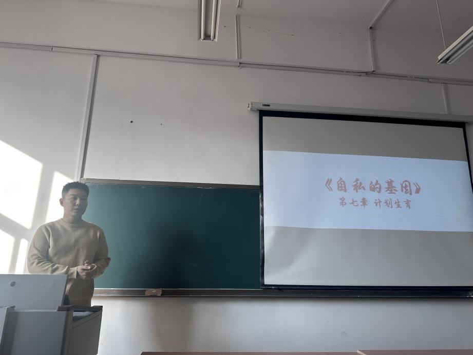 2023级曹一荻同学分享了理查德·道金斯的《自私的基因》第七章关于计划生育的内容。他解释道,道金斯认为基因是进化的基本单位,而非个体或物种,提出生物体只是基因的"生存机器"。分享结束后,他提出了一个引人深思的问题:"你认为人与其他生物选择生育行为的原因相同吗?"这个问题不仅体现了他对所读内容的深入思考,也激发了同学们对人类行为与其他生物行为之间异同的探讨兴趣。