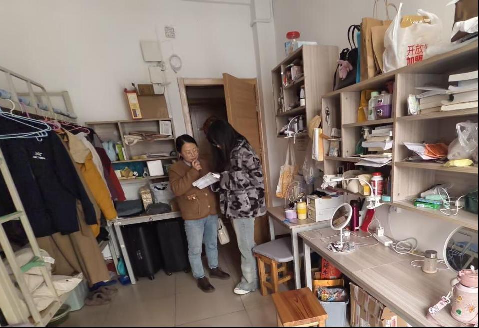研究生辅导员徐莉深入学生宿舍,与同学们进行亲切交流,开展安全与卫生检查工作。