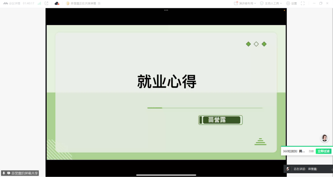 )从自我规划、前期准备和面试技巧三方面详细介绍了在求职和面试过程中的心得体会,鼓励大家勇于尝试、敢于探索;陈晨(就职于烟台市芝罘区委党校)着重从人才引进政策解读、心态调整、试讲准备等方面展开讲述;苗誉露(就职于莱西综合行政执法局政策法规服务中心)围绕个人定位、获取信息、面试技巧几个方面提出建议,鼓励同学们在求职中积极尝试。