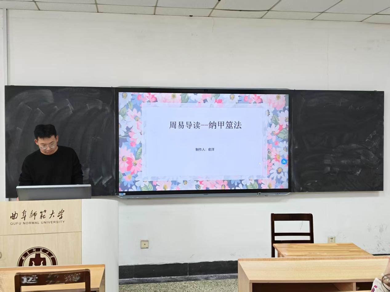 2024级俞洋同学分享的是《周易导读——纳甲筮法》,他主要讲解了自己对于书中起卦与装卦的理解,分享了自己通过阅读书籍学习到的起卦的相关内容,并针对起卦与装卦提出相关问题,引发了同学们对传统文化的思考与兴趣。