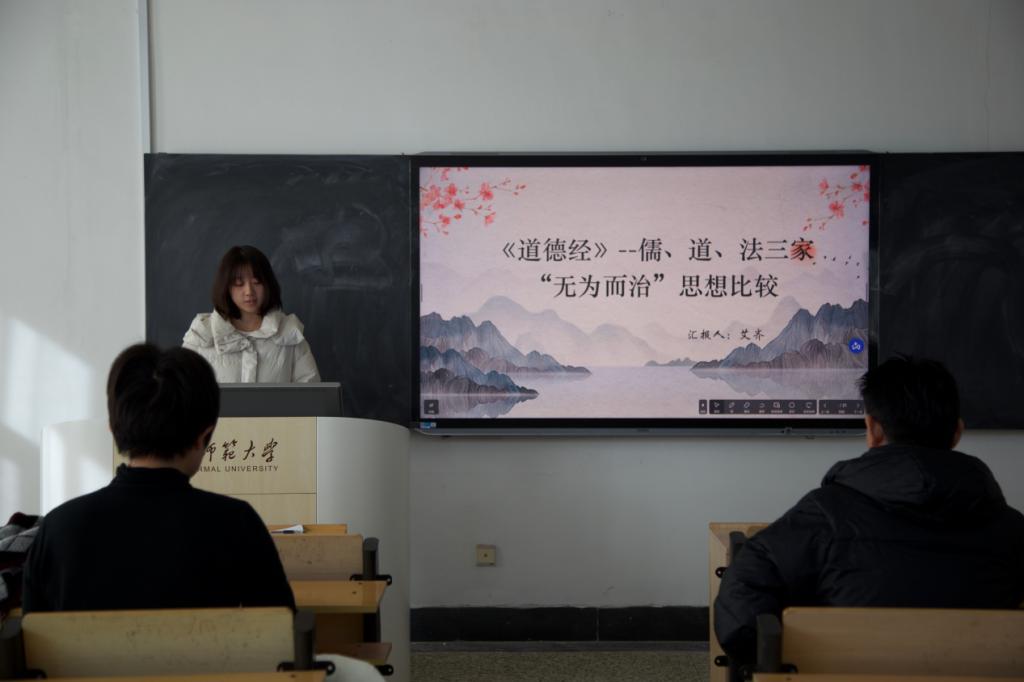 2025级艾齐同学分享的是《道德经》,她聚焦儒、道、法三家“无为而治”思想比较,指出“无为而治”是先秦诸子应对周秦之变的共同政治理念,并提出《中庸》提出“君子而时中”,为何说这种“因时制宜的中庸”不是无原则的“墙头草”,反而能帮当代人破解“选择焦虑”的问题,引发了同学们的深入思考。