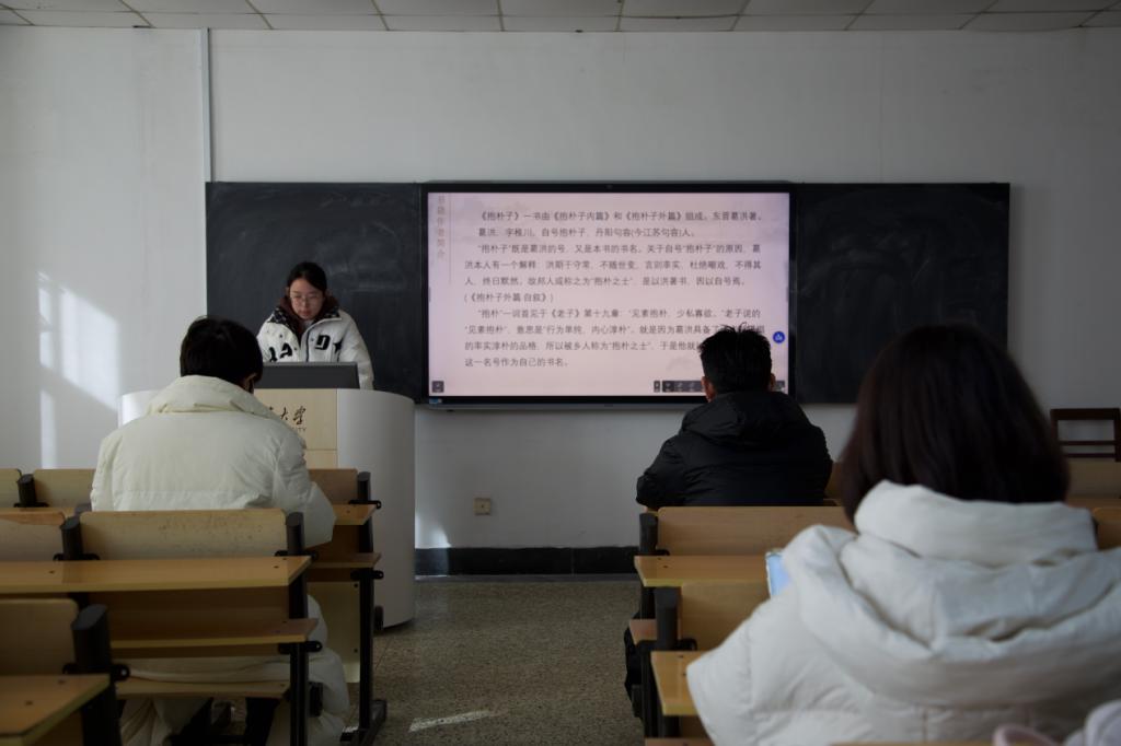 2024级赵隽卿同学分享的是《抱朴子内篇》辨问卷,她围绕葛洪对道教圣人形象的理论重构、《抱朴子内篇》圣人形象的独特性展开,梳理了葛洪将圣人划分为“治世之圣人”与“得道之圣人”的分类逻辑,解读葛洪对圣人亦有凡人属性的认知、成圣需先天禀赋与后天修炼结合的核心观点。