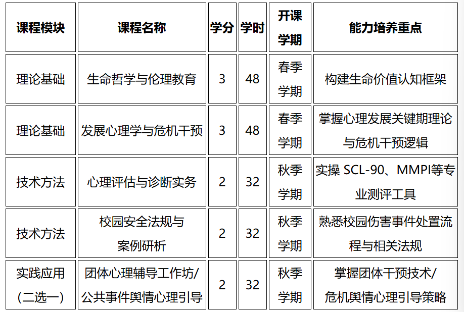 4.精通团体心理辅导、叙事治疗、艺术疗愈等干预技术,可胜任心理健康教育、危机干预、安全管理等相关工作或学术深造需求。