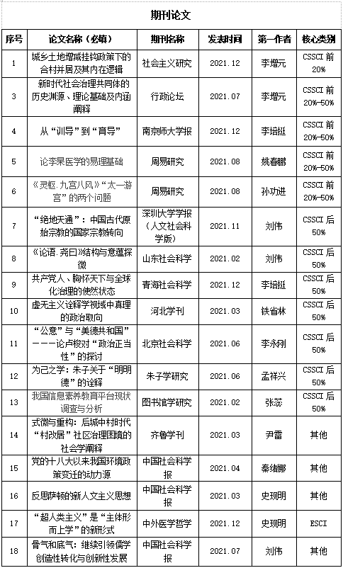 2021年度欧冠直播app 教师共获批国家社科基金项目1项,省部级项目3项;欧冠直播平台 教师在《社会主义研究》、《行政论坛》、《周易研究》等CSSCI核心期刊发表学术论文18篇,出版专著3部,获得省级社科奖励2项。