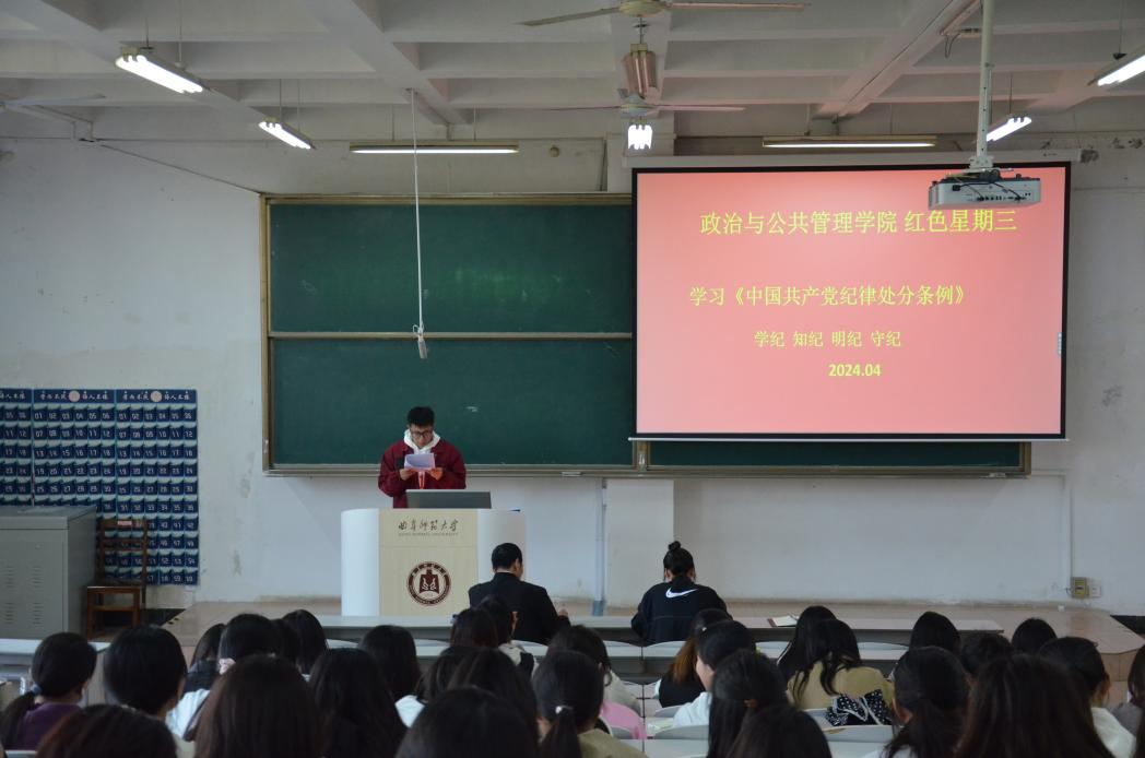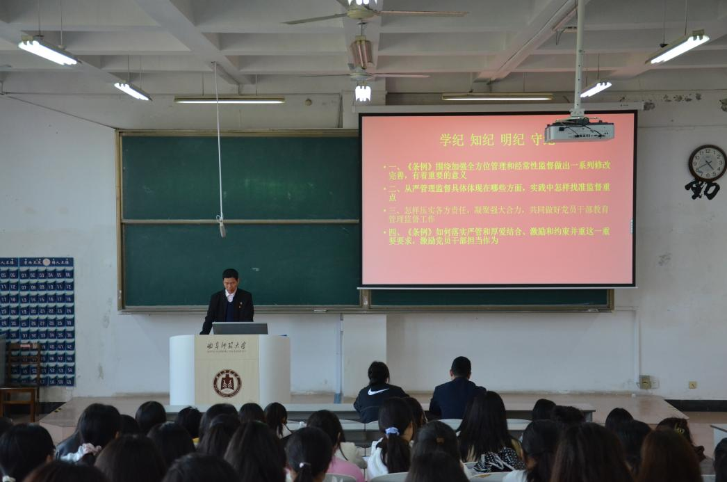 王元如老师作了专题辅导,系统解读了《中国共产党纪律处分条例》。随后,党员代表吴泽文领学《条例》总则部分。