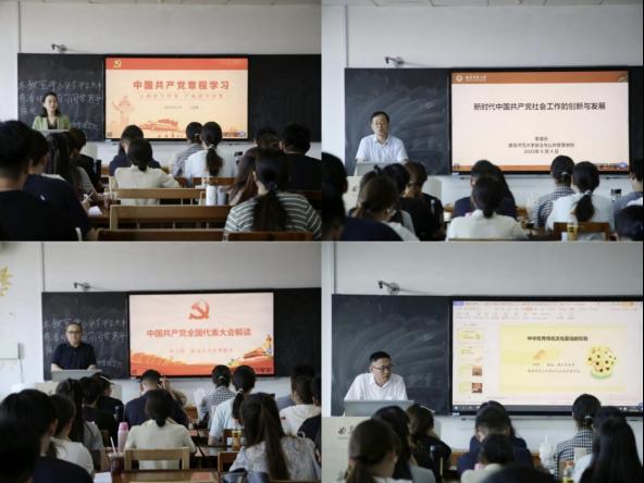 党委书记卢瑞霞、党委副书记院长李增元,副院长林士俊,副院长刘伟分别以《中国共产党章程》学习、《新时代中国共产党社会工作的创新与发展》、《中国共产党全国代表大会》解读、《中华优秀传统文化面临的形势》为题讲授了党课。