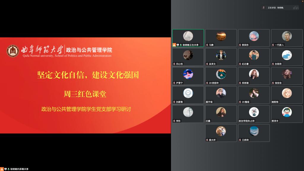 本期“周三红色课堂”围绕“坚定文化自信,建设文化强国”主题展开集中学习研讨。会上,耿晓敏领学了习近平总书记在文化传承发展座谈会上的重要讲话,并表示青年学生党员要坚持以习近平总书记的重要讲话精神为引领,担负起新的文化使命,加强文化知识的学习,坚定理想信念,增强明辨是非的能力,正确把握个人发展与国家发展的关系,将个人理想追求融入到党和国家的事业中来。