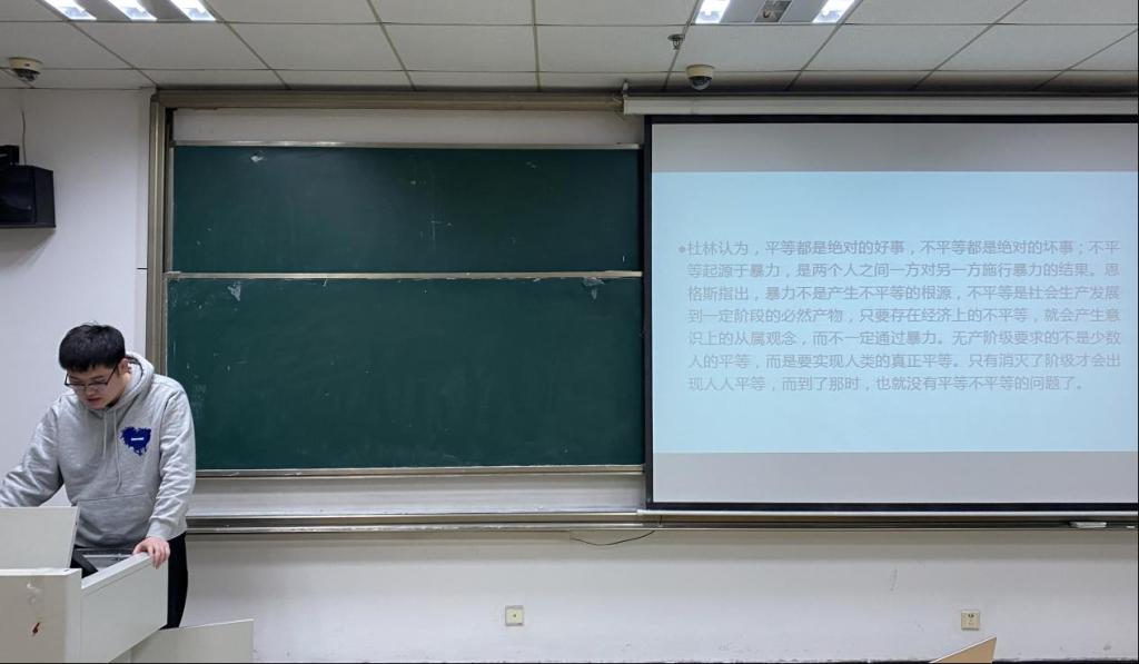 2020级修昊同学就《反杜林论》中恩格斯的平等观念进行读书分享。马克思唯物史观认为,平等不是一个抽象的、人道主义的空洞概念,而是始终与生产方式发展紧密相连,在人的相互关系中所体现出的原则,平等的实质在于社会生产方式的水平和内容,在阶级社会中,平等问题只有在阶级利益的关系中才能得到科学说明。
