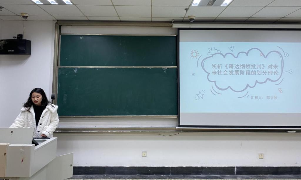 首先,2021级陈香秋同学就《哥达纲领批判》中对未来社会发展阶段的划分理论进行读书分享。陈香秋介绍了马克思关于未来社会发展阶段思想的确立过程,对共产主义社会的过渡时期和高级阶段进行了辨析,并结合现实中社会主义的进程进行了总结论述。