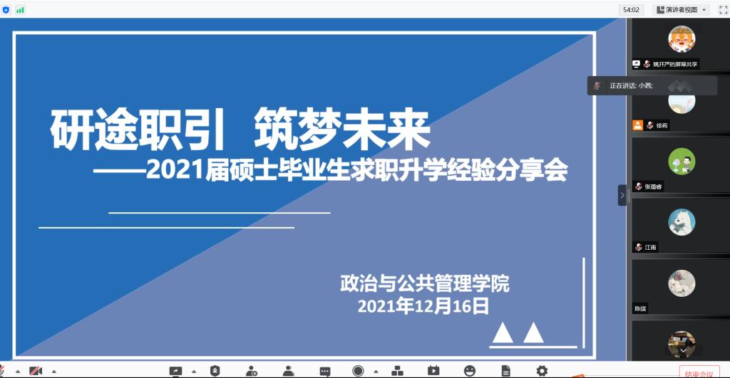 开展以“研途职引,筑梦未来”为主题的优秀硕士毕业生求职升学分享交流会活动,本次会议邀请2021届优秀硕士毕业生张蕴睿、铁小茜、李娜、徐萌分享个人求职升学经验,会议由研究生辅导员徐莉主持,欧冠直播app