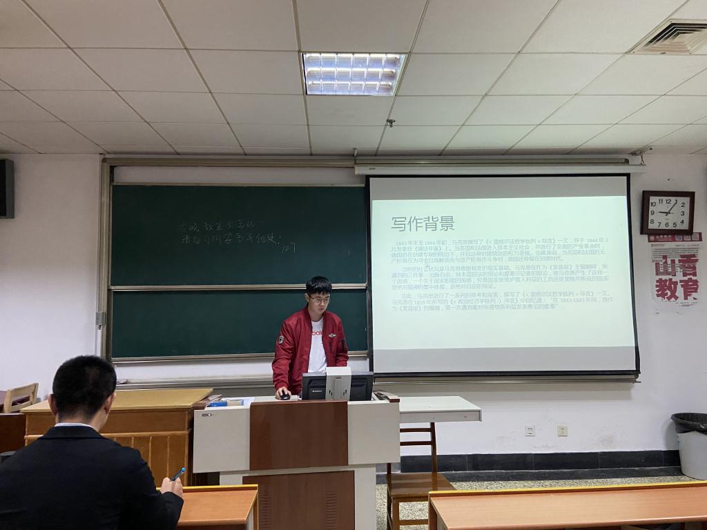 首先,李玉琳同学就《< 黑格尔法哲学批判 > 导言》一文进行了分享,这一文的发表标志着马克思从唯心主义者转变为唯物主义者 , 从革命民主主义者转变为共产主义者,思想深刻,是马克思思想转变过程中的又一块里程碑。