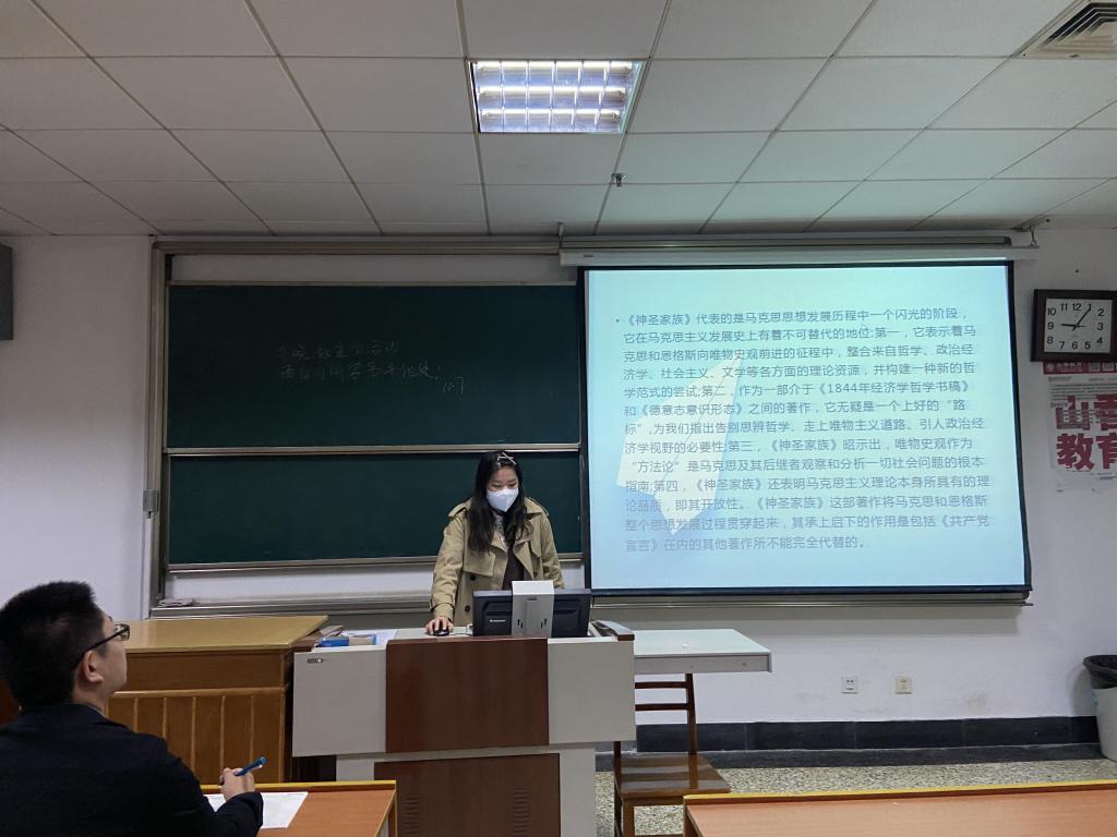 随后,2020级沈琦同学为大家分享了《神圣家族》一书。马克思和恩格斯突破了唯心主义思辨哲学的束缚,将研究中心转向现实和群众,这对于马克思主义的形成,特别是唯物史观的建立具有重要理论意义。