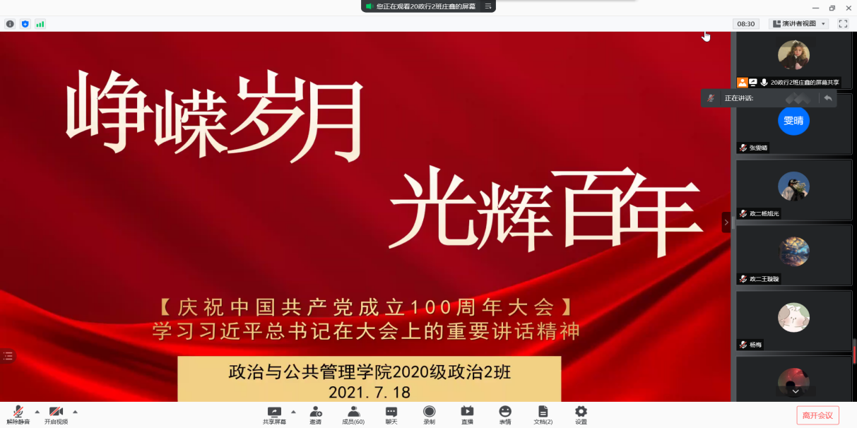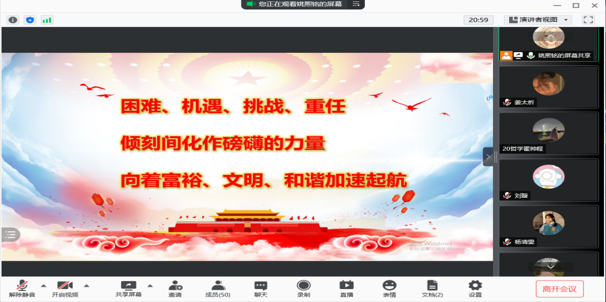 2018、2019、2020级各团支部组织开展主题团日活动学习习近平总书记讲话精神。同学们在会议学习中熔铸了“强信念、创思维、跟党走”的坚定信仰,强化了新时代新青年的责任意识与使命感,并将自己的所感所悟汇集成篇。作为高年级的学生,2018级即将踏入社会成就一番作为,具有更加强烈的责任意识与奋斗精神。2018级同学有感而道:“千秋伟业,百年只是序章,还有更多艰难险阻需要我们去攻克,还有更大胜利等待我们去夺取。作为新时代的青年,我们要不忘初心,砥砺前行,为实现中华民族的伟大复兴不懈奋斗!”理想之光照亮奋斗之路,信仰之力开创美好未来。2019级同学将自身发展方向融入时代洪流,借时代东风之力,扬理想之帆。2020级作为新生力量,具有巨大的创新能力和发展潜能,更加为时代建设献计献策,添砖加瓦。欧冠直播平台