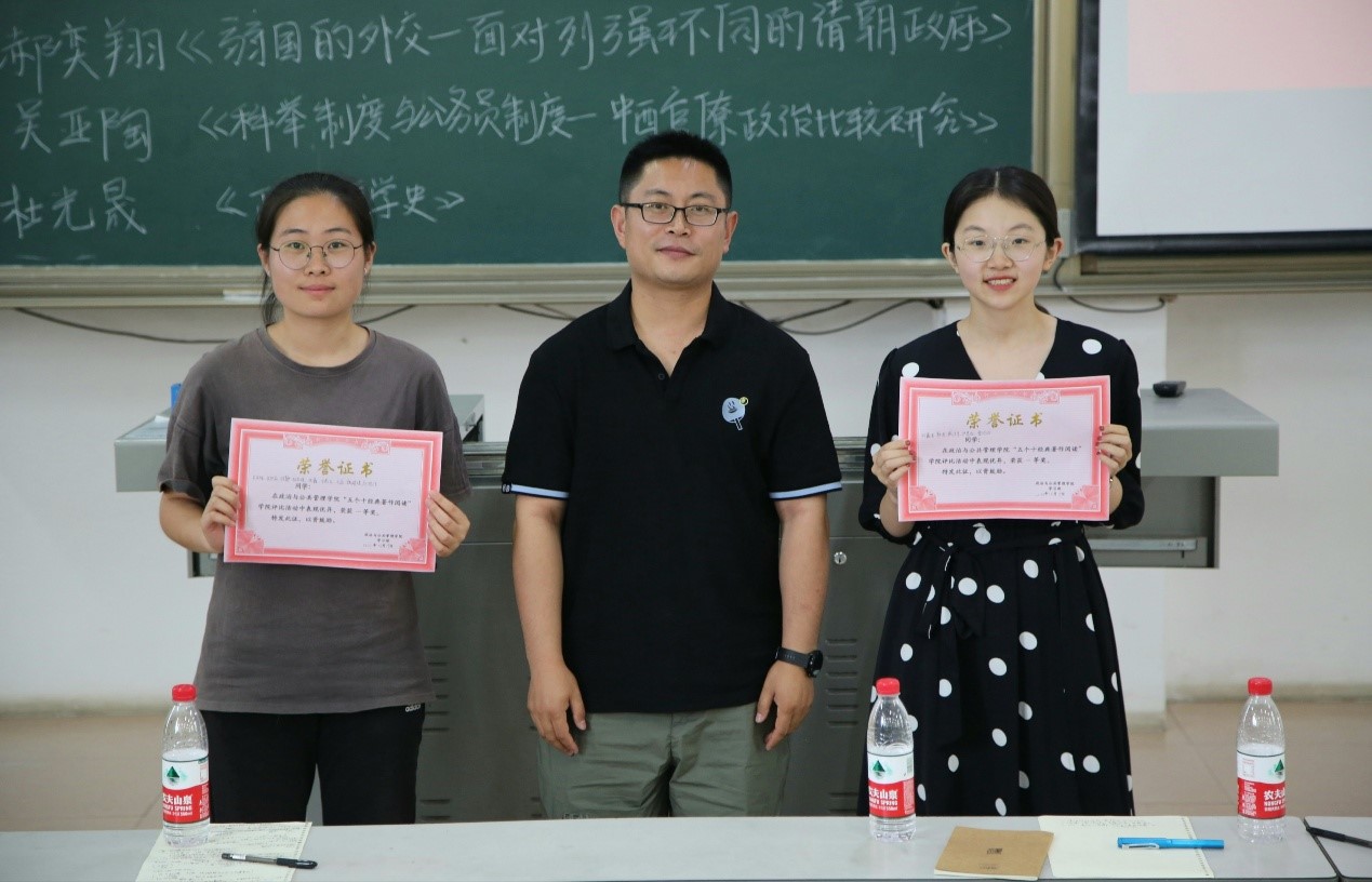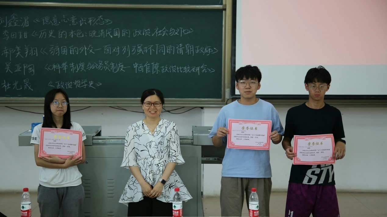 比赛结束之际,依据各位评委老师打分情况,最终,第六组、第九组荣获一等奖;第八组、第二组、第十组获得二等奖;第四组、第一组、第七组、第五组、第三组获得三等奖,在场评委与各小组合影留念,此次2019级经典著作评比活动圆满结束。