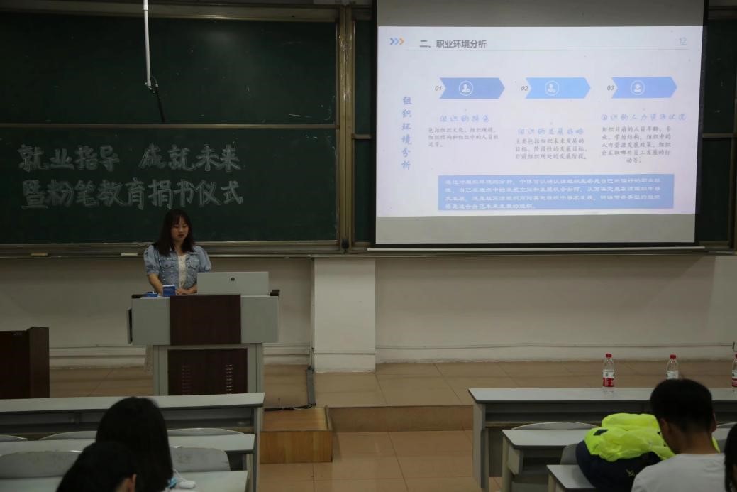 在校大四毕业生的信息交流,为在校生排忧解难;联合粉笔教育为同学们捐赠就业分类指导用书,明确各类就业考试内容,为将来创业就业提供切实可靠的帮助。希望本次就业指导活动以及图书捐赠能帮助同学们明确目标、备战各种考试,树立理想、成就未来。希望同学们更加清晰地规划未来,认真聆听就业指导,积极参与捐赠活动。每一条路也都不易,要想成就我们自己,就要有耐心、有恒心、有毅力,通过就业指导、指导就业,合理利用时间,抓住机遇。接着,创业就业与校友服务部干事孙雨荷组织进行就业指导讲座,全面分析讲解各类就业知识和影响就业的诸多因素。她结合当前发展趋势,通过对当今就业情况的分析,结合自身追求与社会需求,建议同学们有计划有目标的进行学习,做好职业规划,在场观众认真聆听并记录。最后,孙雨荷进行评价总结并向同学们传达美好祝愿。