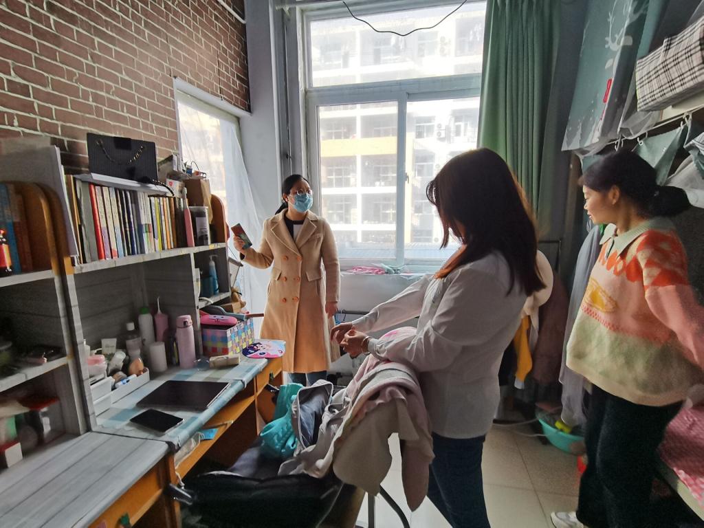 团委书记王元如、2017级辅导员武莉华、2020级辅导员耿晓敏走进园区,前往各级学生宿舍进行检查,宿管部成员和各级班团陪同。
