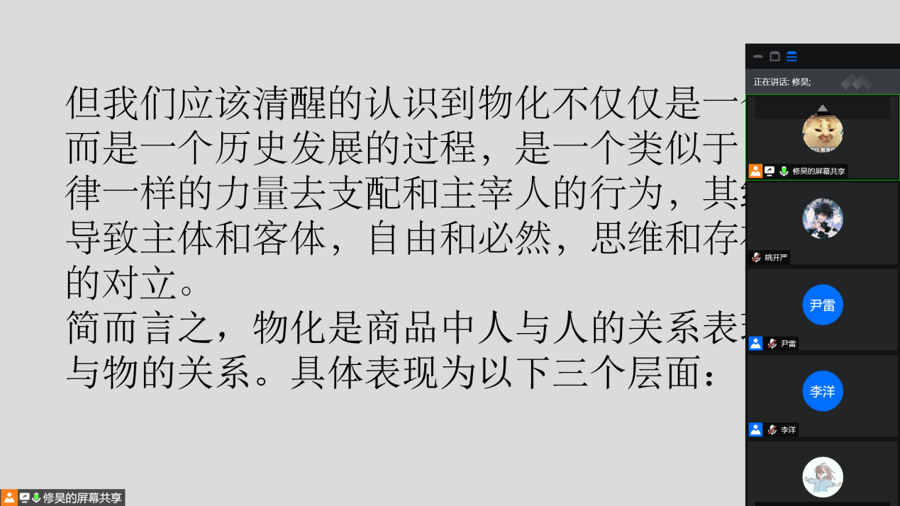 2020级修昊同学分享了卢卡奇的《历史与阶级意识》,卢卡奇从马克思关于商品拜物教的论述出发,提出了自己的物化理论。这不但是对马克思异化理论的发展,更是引领了后来霍克海默、弗洛姆、马尔库塞等人关于物化、异化问题研究的高潮。即使是在今天的中国,用卢卡奇物化理论分析社会问题,仍然具有指导意义。