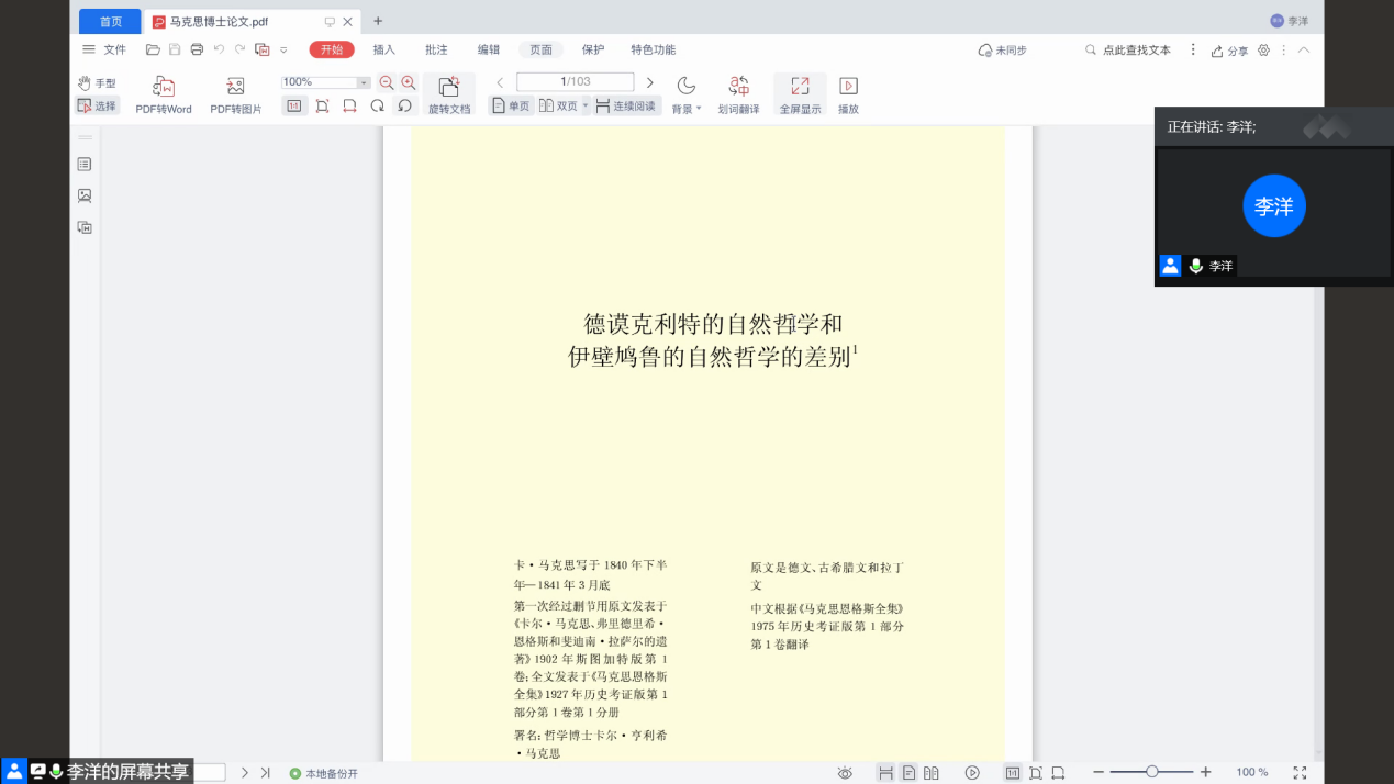本期政研论坛读书交流会围绕马克思主义哲学相关书目及人物展开讨论。首先,2019级李洋同学为大家分享了马克思的《德谟克利特的自然哲学和伊壁鸠鲁的自然哲学的差别》。本篇博士论文通过对德谟克利特的物理学和伊壁鸠鲁的物理学之间的关系的判断、把他们的自然哲学等同起来所产生的困难和它们之间的一般原则差别这三部分的叙述,肯定了伊壁鸠鲁反宗教的自由思想,这也是马克思自由思想的重要出发点。马克思发现了历史唯物主义和剩余价值论,号召工人阶级反抗压迫,获得实现自由的客观条件,其博士论文是自我意识自由研究的重要文献。