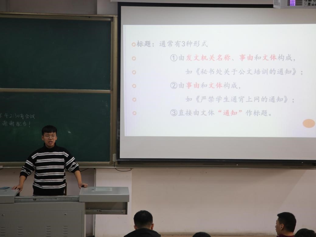在本次培训中,郝奕翔从“公文定义”、“通知撰写”、“策划书撰写”、“工作计划撰写”、“工作总结撰写”、“公文语言风格”六个方面展开讲解。培训伊始,郝奕翔向同学们介绍公文的定义。他强调,公文有广义狭义之分,理清公文定义利于学生干部规范公文写作。随后,郝奕翔讲解了通知的构成要素:标题、正文和落款是基本的构成要素,而正文又包括称呼、缘由、事项、要求等。他创造性地通过引入图片的方式,使讲解更为生动形象,调动同学们的积极性。接着,通过讲解本次元旦晚会的案例,他提出策划书撰写的注意事项和要求,并对工作总结和工作计划的撰写提出规范建议。最后,郝奕翔着重分析公文语言的特点。公文语言具有政治性、规范性、简明性等特点,要注意规范用字,提高公文的严谨性。