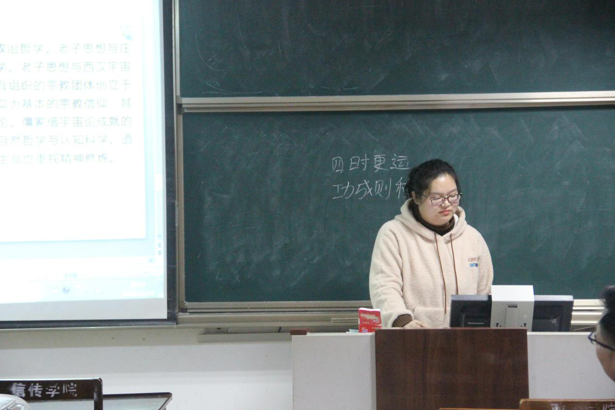 随后,2020级董津含同学就郭齐勇编著的《中国哲学史》一书进行了分享,重点讲述了从先秦到宋明时期中国儒学的发展历程。儒家由中国最著名的哲学家孔子所创立、孟子所发展、荀子所集其大成。儒家思想经过几千年的传承,一直不断发展、与时俱进、昂扬向上,堪称民族脊梁。