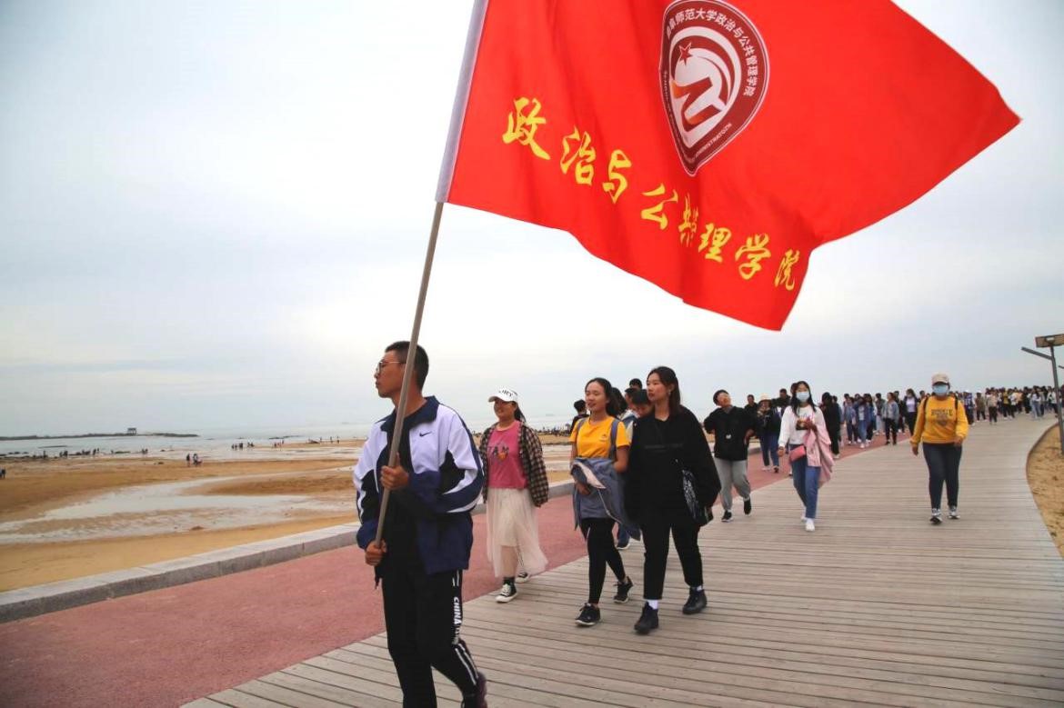 拉练队伍从D楼前集合出发,步行前往山海天海岸海边。一路上同学们热情高涨,昂首挺胸,秩序井然,红色的院旗高高飘扬,指引前进方向。期间,学长们悉心指导,耐心处理同学们在行进过程中出现的问题。