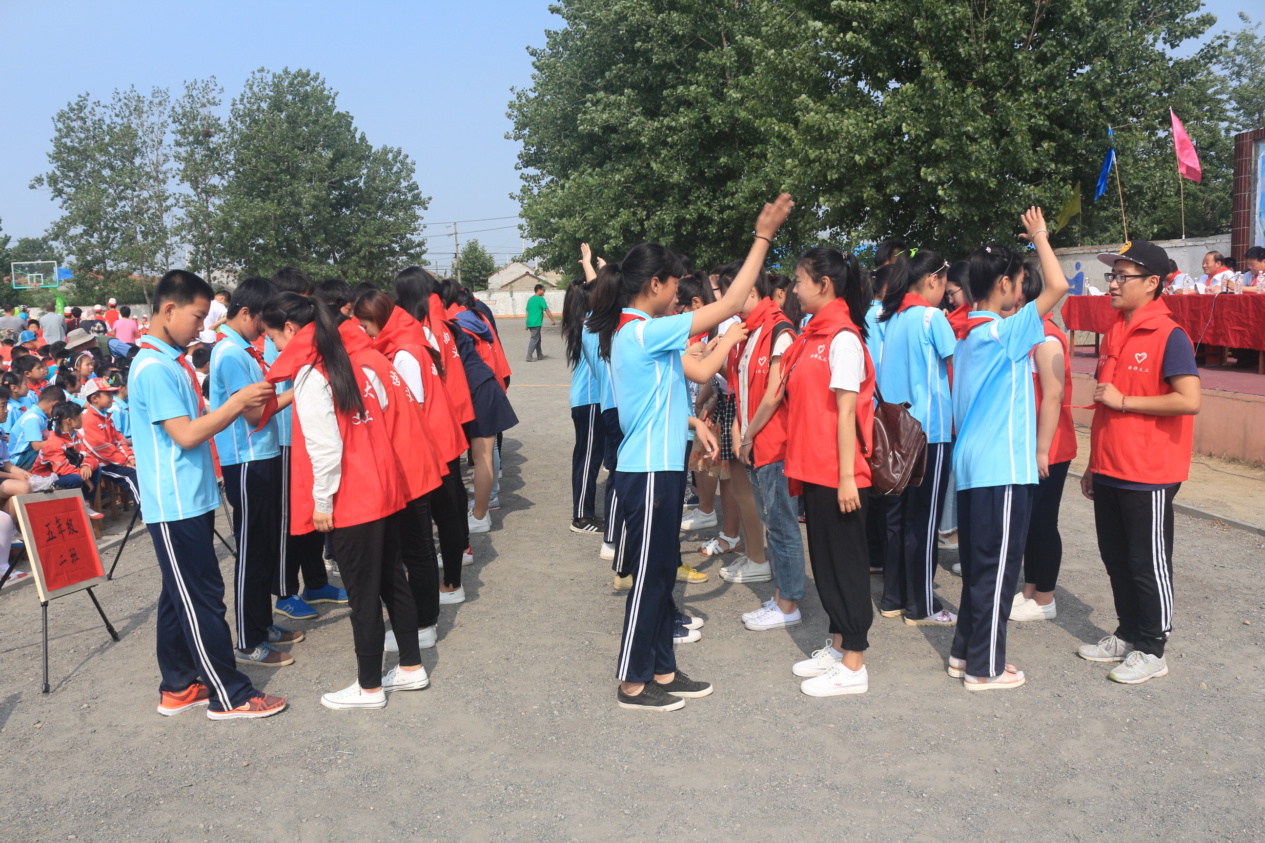 一大早,曲师义工兵分两路,分别前往东港区后河镇山河小学和南湖镇黄山小学,参加两个学校的庆“六一”大会。大会伊始,山河小学的同学们为义工们戴上鲜艳的红领巾,校领导为优秀支教义工颁奖,以此表示对爱心支教的感谢、肯定和支持。曲师义工为此次汇演做了精心准备,带领小朋友们一遍遍认真排练,最终以歌舞表演、电子琴演奏、诗朗诵等色彩纷呈的节目赢得了师生、家长和义工们的阵阵掌声。