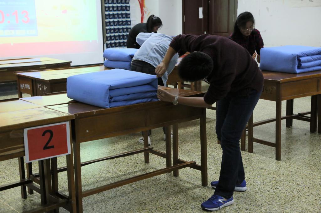 学生会主席李增珣发表简短讲话。闫力认为此次活动的举办能够锻炼同学们整理内务的基本能力,并希望大家赛出水平、赛出风格;李增珣谈从小事做起的重要性,并对活动的顺利开展表示祝贺。比赛伊始,师哥师姐为同学们带来叠被子标准示范,两位主席也参与其中,充分发挥模范带头作用,为上场选手作出表率。正式比赛参赛选手50人共分为十组,每组随机搭配五人上场,限时5分钟。伴随着欢快轻松的背景音乐,同学们迅速开始整理被子,熟练地运用各种技巧手法,对压实理平、卡出条印、修边捏线等方面进行细致处理,在规定的时间内,原本摊平的被子变成横平竖直、整洁美观的“豆腐块”呈现在同学们眼前,被子外观棱角分明,折缝清晰,没有褶皱凹陷,精彩的叠被子过程赢得观众热烈的掌声。此外,比赛期间穿插的“齐心协力”、“你比我猜”、“反常态”等游戏环节,充分活跃现场气氛,同学们幽默风趣、生动活泼的互动一次次将比赛推向高潮。