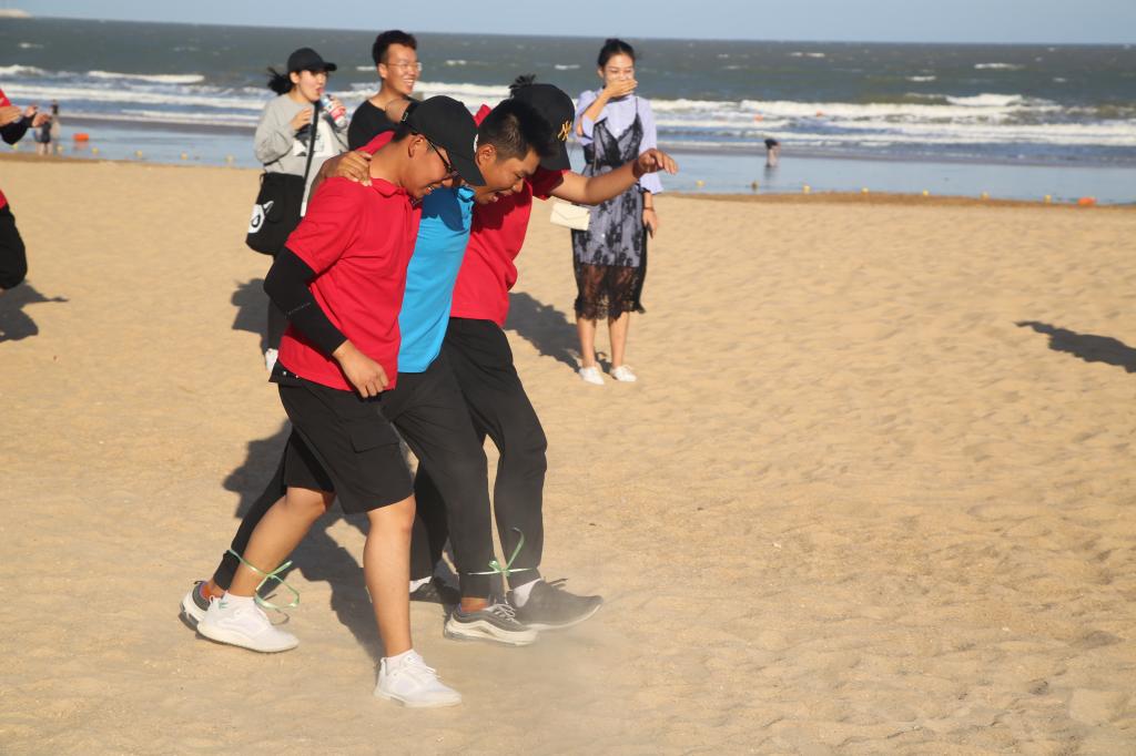 在四人三足比赛中,参赛选手四人一组,两两进行绑腿。比赛过程中,各组队员齐心协力,默契配合,获得场下阵阵喝彩。