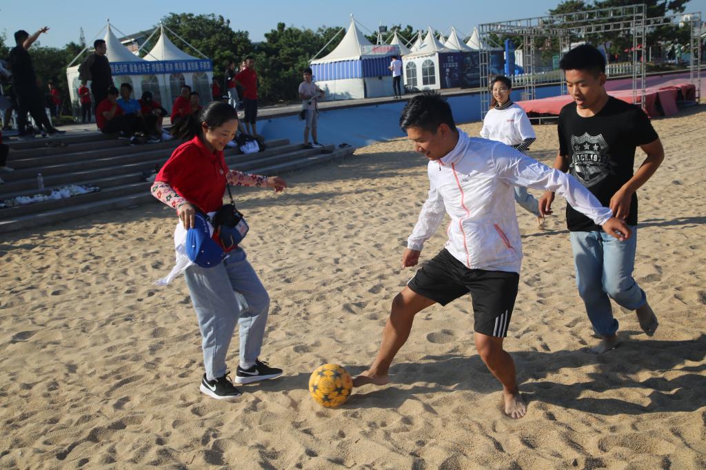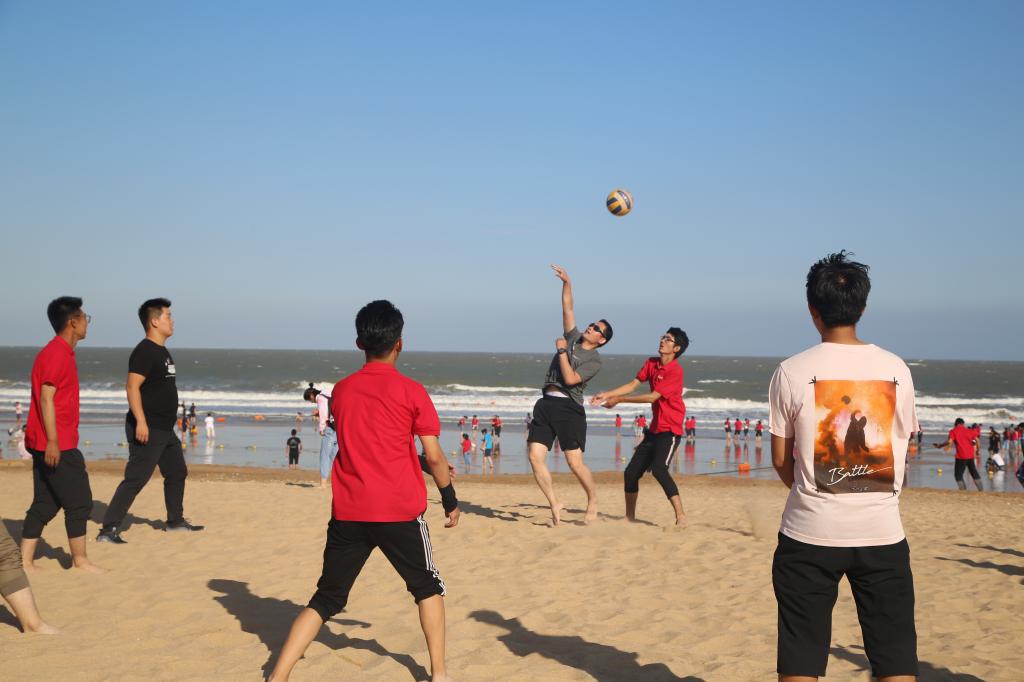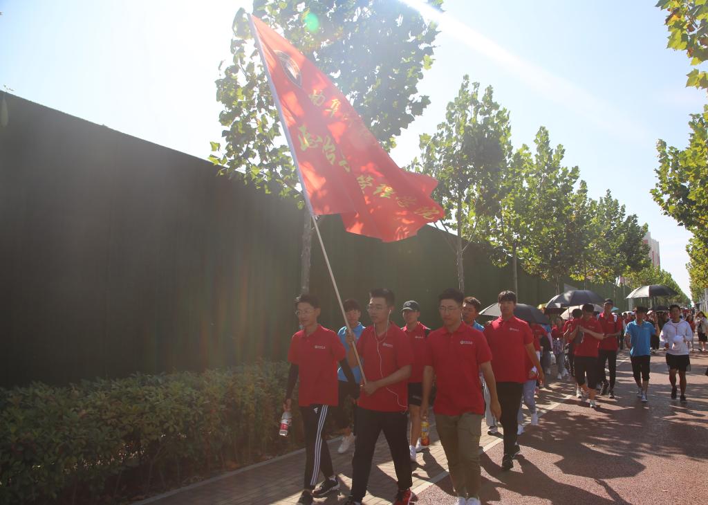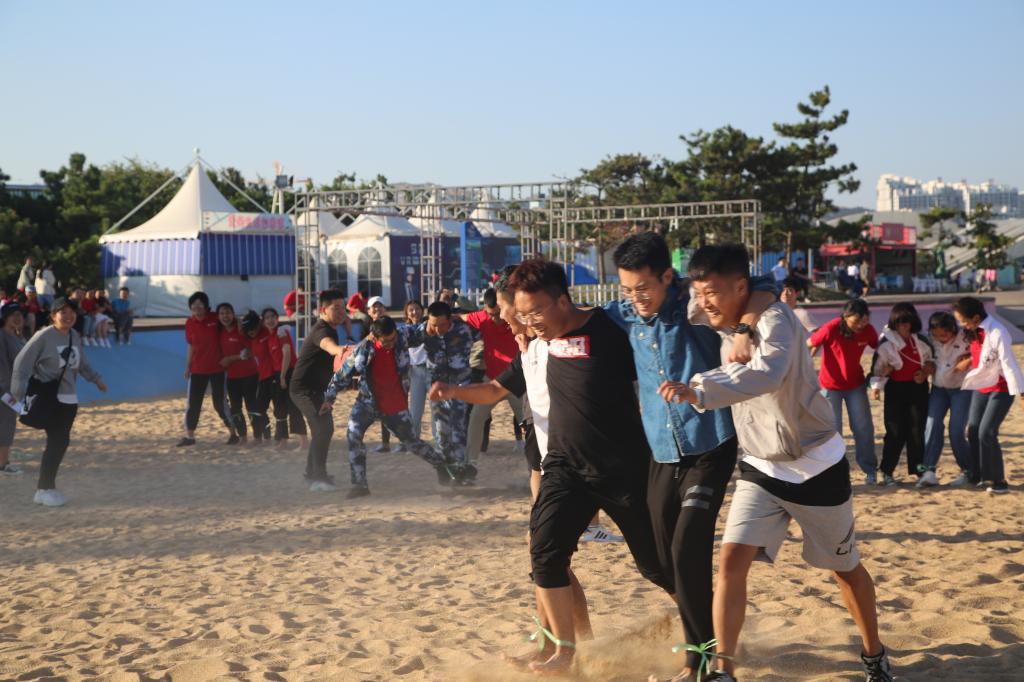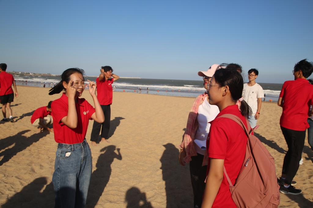 此次活动采取徒步的方式,从学校北门出前往日照市第三海水浴场,并在海边进行相关活动。一路上,同学们身着学部红色文化衫列队前行,秩序井然,壮观的队伍引得路人驻足观看。高素质的言行举止充分展现了曲阜师范大学马克思主义学部学子的风采。学部的红旗在旭日和风中随风飘扬,为秋日的景象增添了一抹绚丽的光彩。到达目的地后,相关成员组织新生进行排球对抗赛、足球传递赛、你画我猜、三人四足等游戏,老师和师哥师姐们也参与其中,互动中伴随着一声声欢声笑语。