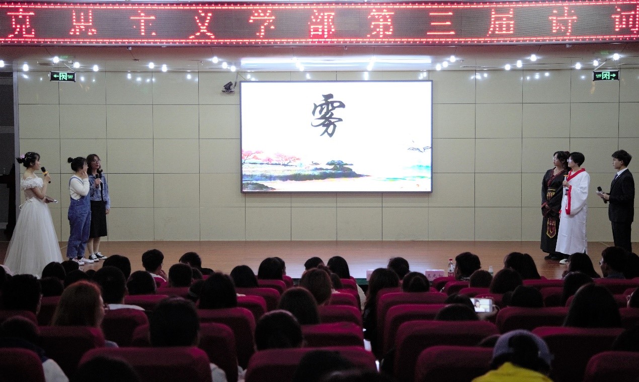 团委学生会文艺部、边缘文学社和大学生就业创业协会共同举办。比赛在古风古韵的舞蹈《山鬼》中拉开帷幕。经过初赛和复赛的角逐,共有8支队伍入围决赛。本次比赛共分三个环节,第一环节十六位选手两两组队,在抽签进行分组答题后,共有四支队伍脱颖而出;第二环节四支队伍分别采用自己擅长的方式对喜爱的诗词进行解读,选手们各施才艺,运用情景演绎、歌舞表演等方式展现诗词内容,形式新奇,趣味十足,激发起观众对诗词的热爱,引得观众席掌声阵阵。