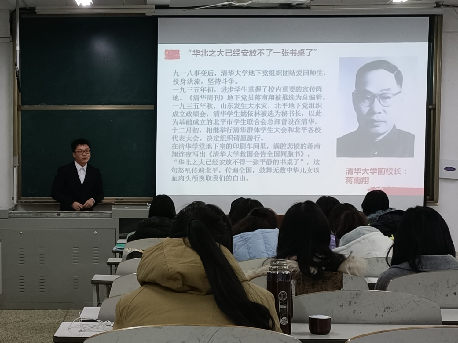 回顾峥嵘岁月,铭记历史时刻。宣讲活动在“一二·九”运动的视频回顾中拉开帷幕,同学们认真听讲、神情专注,纷纷展现了高度的热情,随后主讲人逐步介绍了“一二·九”运动的背景、过程,揭示了它推动抗日民族统一战线的建立,标志着中国人民抗日民主运动新高潮的到来,公开揭露了日本帝国主义侵略中国,吞并华北的阴谋,打击国民党政府的妥协投降政策,大大地促进中国人民的觉醒的伟大历史意义。随着清华大学纪念“一二·九”运动访谈视频的分享,在同学们雷动的掌声中宣讲活动步入尾声。最后,主讲人呼吁大家铭记历史,勿忘国耻,坚定理想信念,坚定永远跟党走的信心,树立与祖国和人民同呼吸、共命运的精神,把实现个人的人生价值同中华民族伟大复兴、建设中国特色社会主义现代化强国的宏伟目标紧密地结合在一起,甘于奉献,勇于奋斗,至此本次宣讲活动圆满结束。