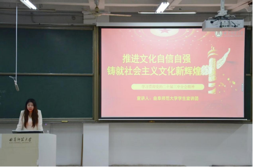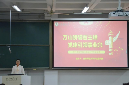 为深入学习贯彻党的二十届三中全会精神,曲阜师范大学学生宣讲团通过“推进文化自信自强,铸就社会主义文化新辉煌”和“万山磅礴看主峰,党建引领事业兴”两个专题,对会议进行深入解读。