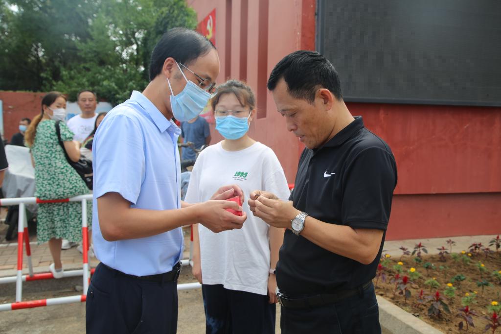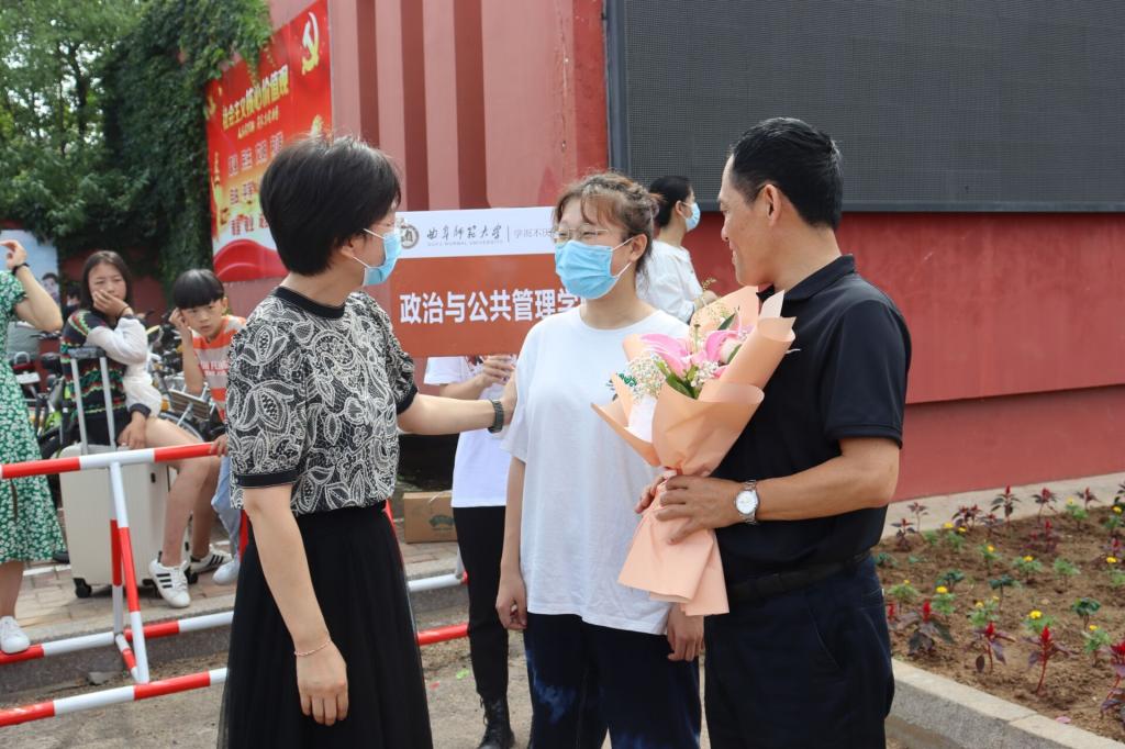 在学校北门接站处为他们准备了一场特殊的“报到仪式”,党委书记卢瑞霞书记为新生赠送鲜花,副院长李增元为父女二人佩戴校徽,并共同合影留念。