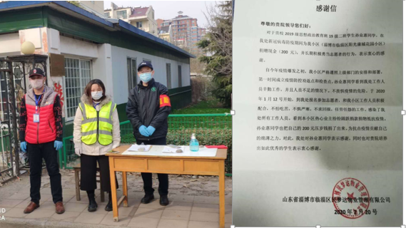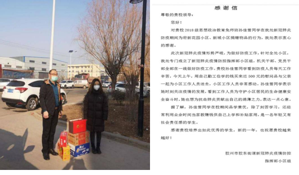 除此之外,学部学子尽己之能助力一线,以实际行动为抗疫加油,获得了社会外界的好评。2018级思政免师班的孙佳雪同学用自己课余时间勤工俭学赚来的近五百元钱为当地参与防疫一线的工作人员买来八宝粥、方便面等物品。胶州市胶东街道新冠肺炎疫情防控指挥部小区组向学校发来感谢信,表达了对她这一举动的高度评价与赞扬。2019级思政二班的孙业惠同学在新冠病毒防疫期间为所在小区做出突出贡献,小区物业特向她发来感谢信,对其当仁不让、冲锋在前的精神表示肯定与赞赏,对其捐赠现金、志愿服务的行为表达衷心感谢。