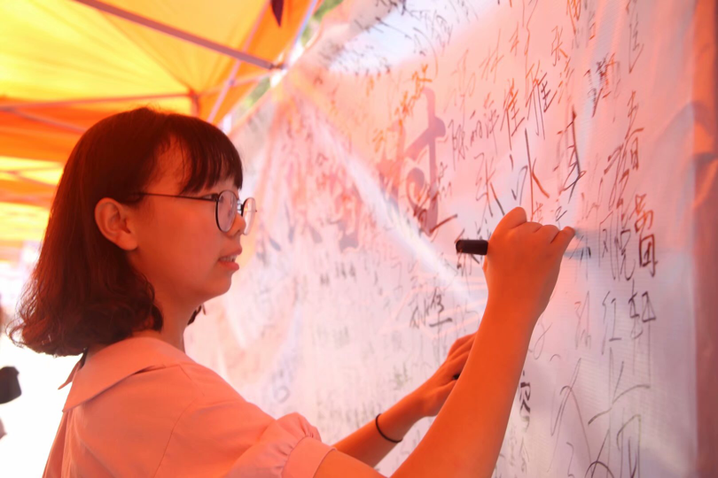 特色的“签名墙”也吸引了许多新生、家长合影留念,为新生进入大学第一天的初心留忆。