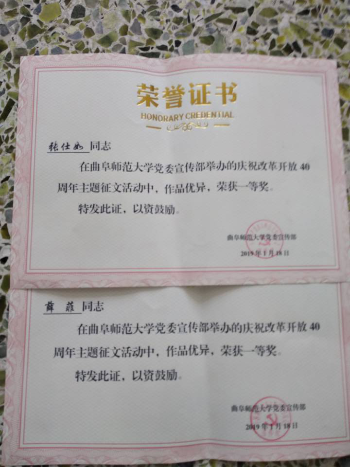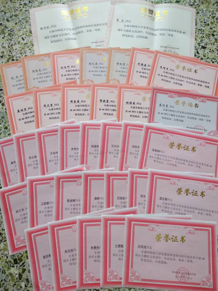 在学校党委宣传部组织的庆祝改革开放40周年主题征文比赛中,欧冠直播app 积极组织,学生踊跃参加,共220篇征文提交学校。经过学校评审,薛菲、张仕如2人荣获一等奖,李明书、李雅洁等13名同学荣获二等奖,齐金枝、周玉莹等20名同学获得三等奖,他们在本次征文活动中真情流入、有感而发,其他参赛同学同样笔下生花。所有参赛者都将自己心中的曲园复兴与对改革开放的展望描绘尽致。